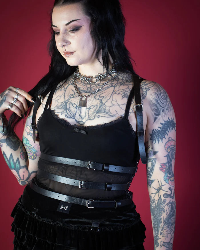 Crafted with cruelty-free vegan leather and adjustable buckles for a perfect fit, the harness features heavy-duty metal hardware and a cross-front design that adds structure and power to any look. Layer it over mesh, wear it solo, or pair with your favorite all-black ensemble — this harness doesn’t ask for attention; it demands it.